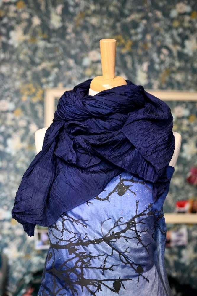 Velký šál z neprůsvitného hedvábí HABOTAI. Díky vrapované úpravě se šál velmi příjemně a pohodlně nosí. Neelektrizuje a nevyžaduje žehlení. Tento velký šál se neztratí ani v zimě v kabátě, v létě jím zahalíte ramena, když slunce zapadne a ochladí se.